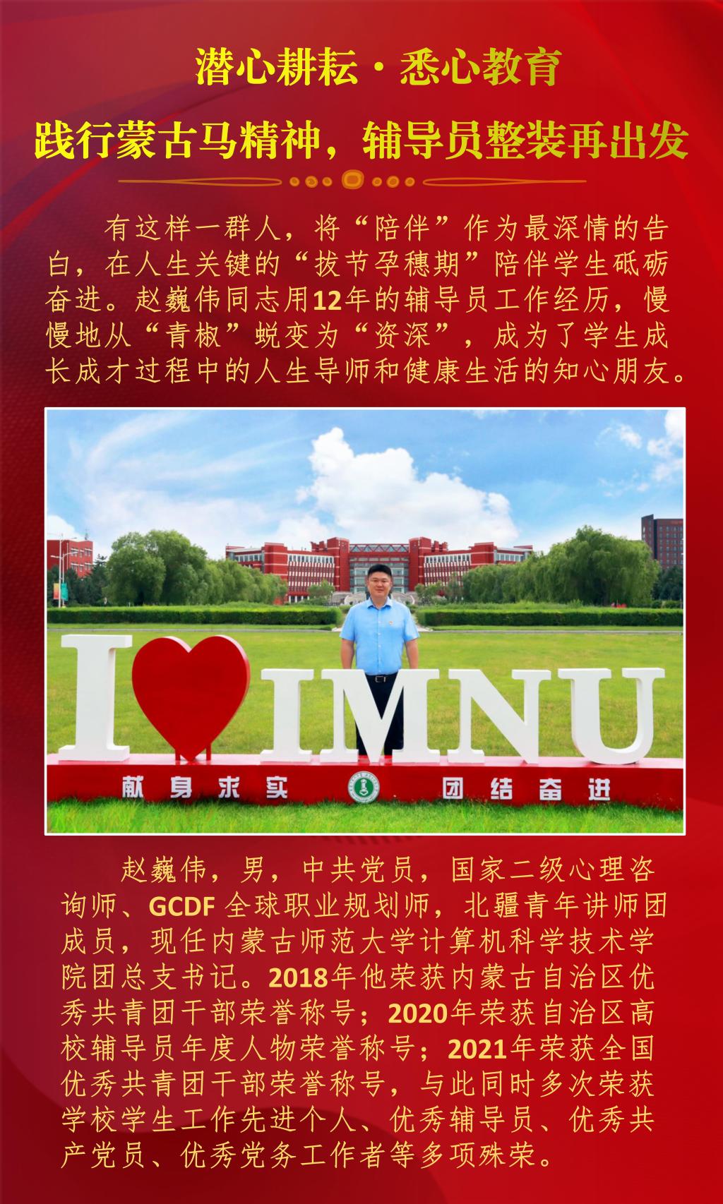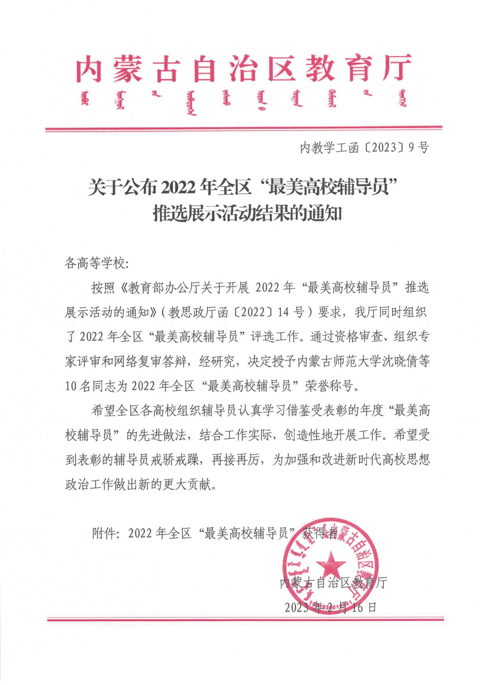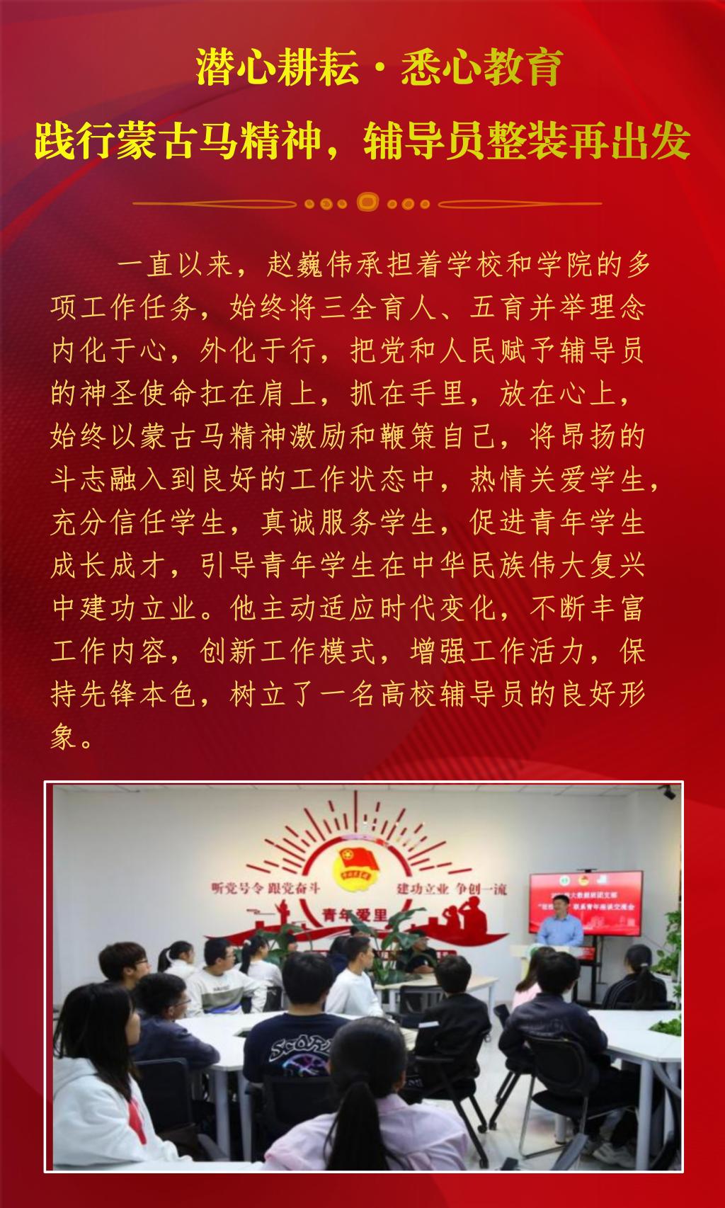 近日,内蒙古自治区教育厅公布了2022年全区最美高校辅导员推选展示活动的结果,经过资格审查、组织专家评审和网络复审答辩,授予10名辅导员“2022年全区最美高校辅导员荣誉称号”。太阳官网辅导员赵巍伟获此项荣誉。