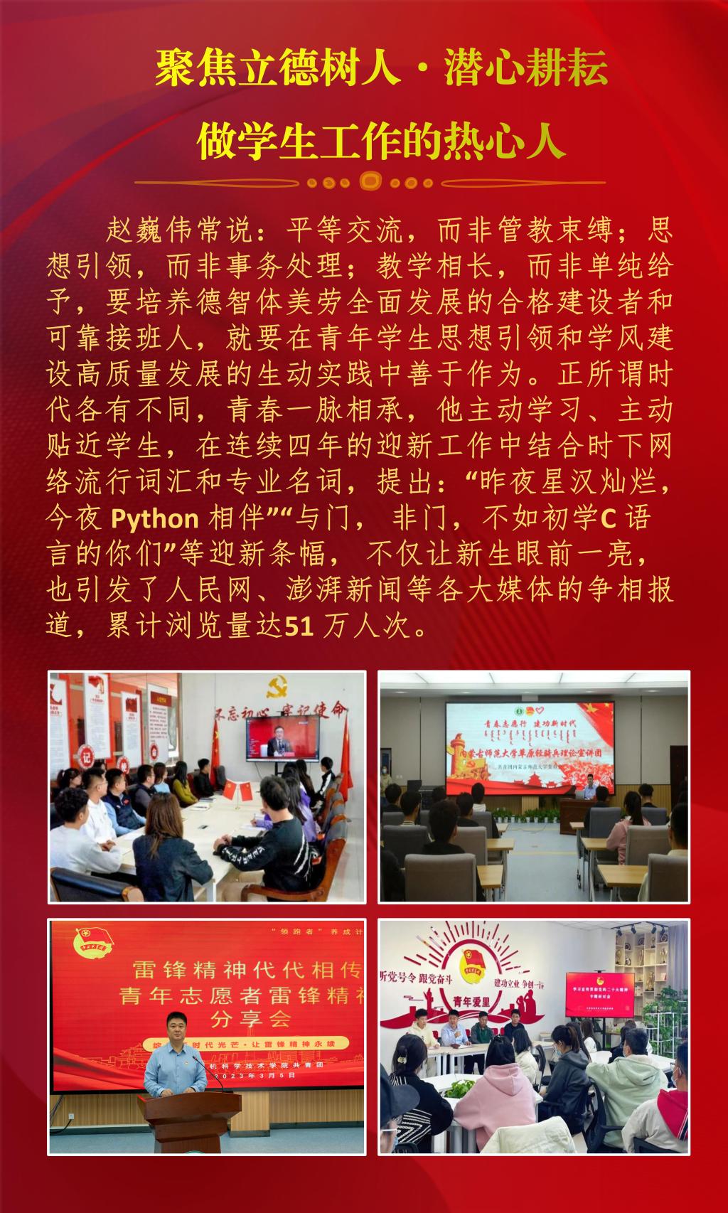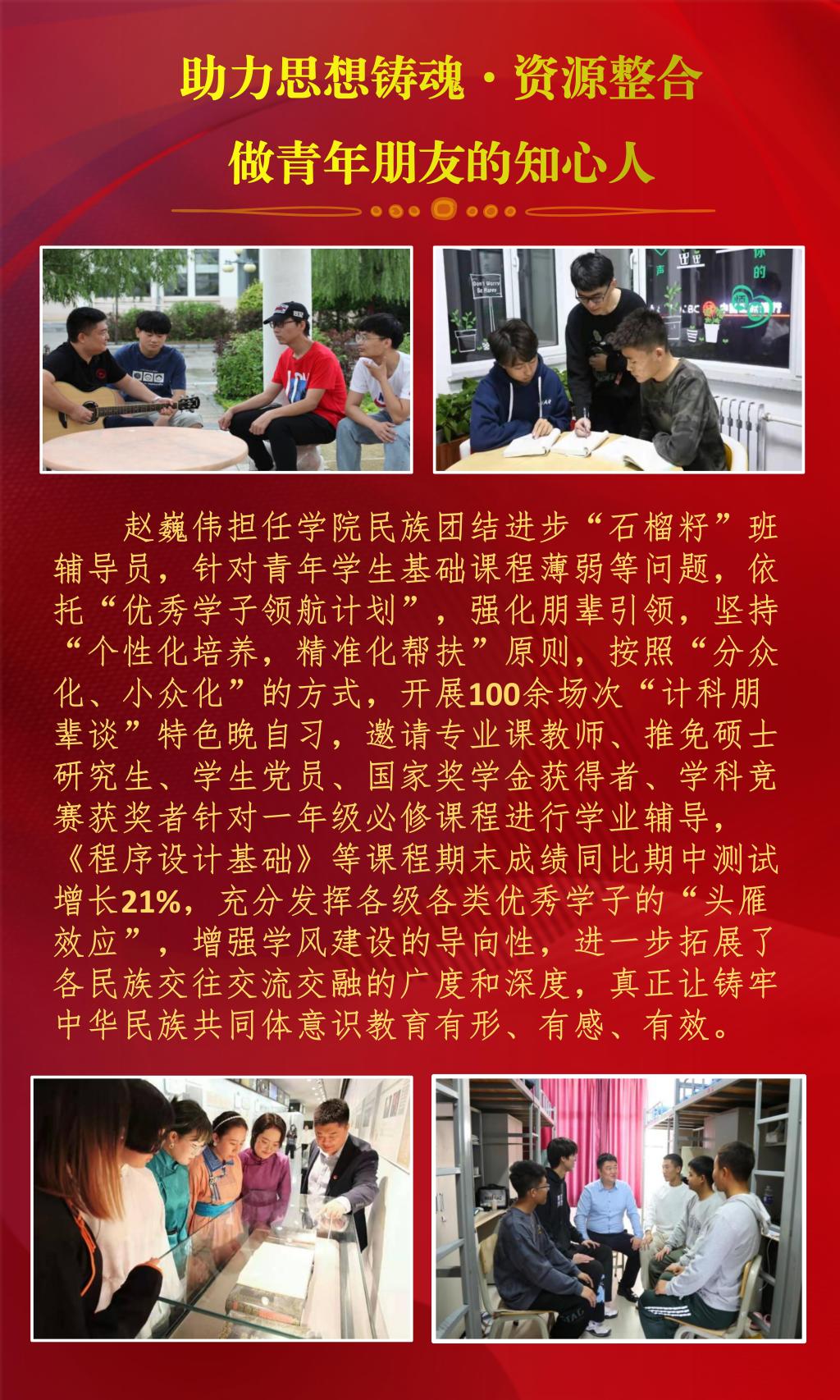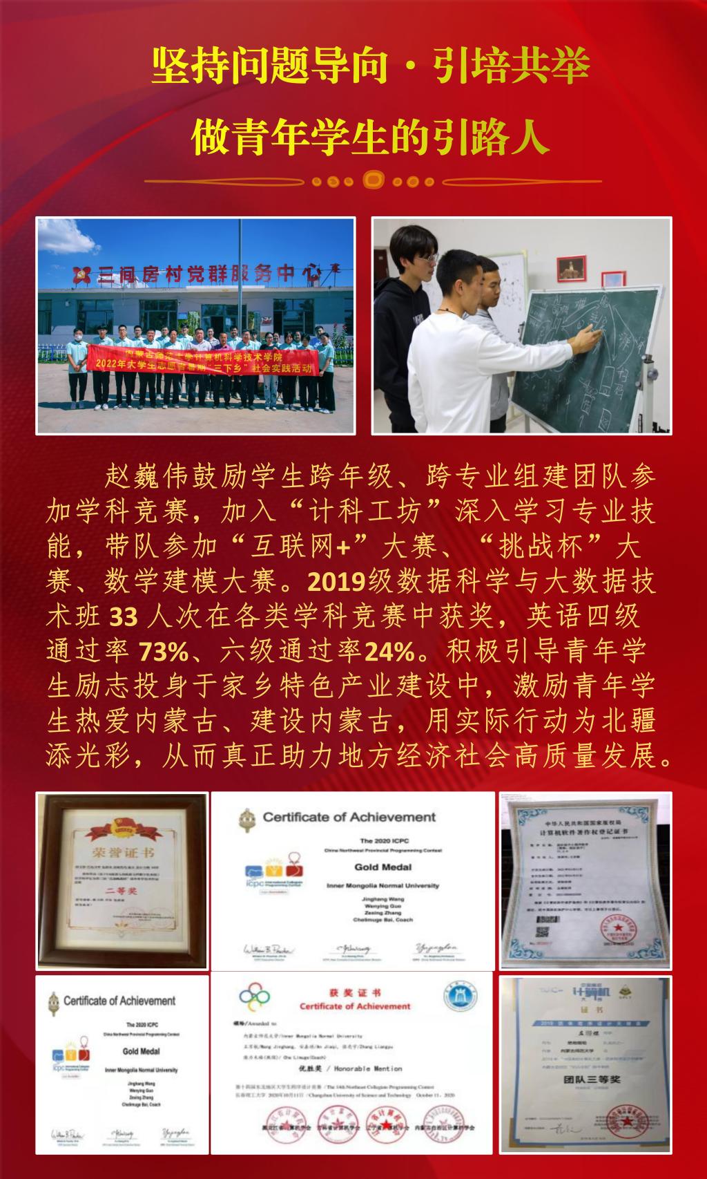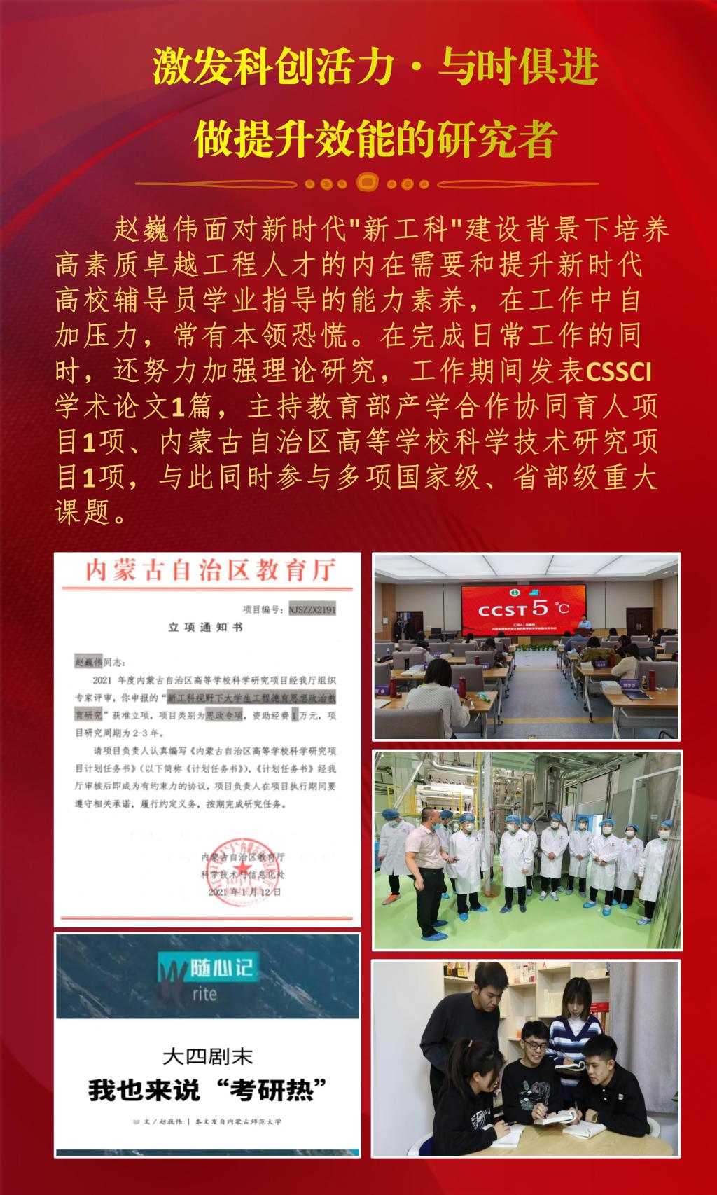 近日,内蒙古自治区教育厅公布了2022年全区最美高校辅导员推选展示活动的结果,经过资格审查、组织专家评审和网络复审答辩,授予10名辅导员“2022年全区最美高校辅导员荣誉称号”。太阳官网辅导员赵巍伟获此项荣誉。