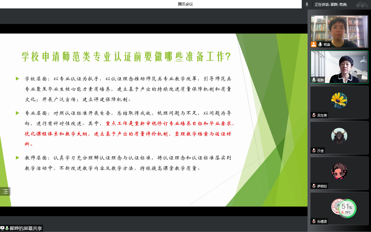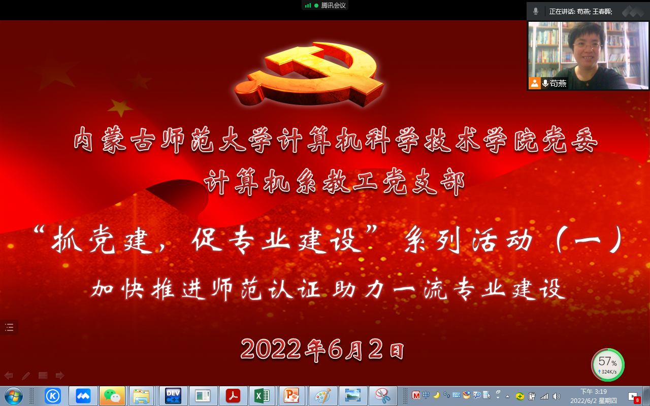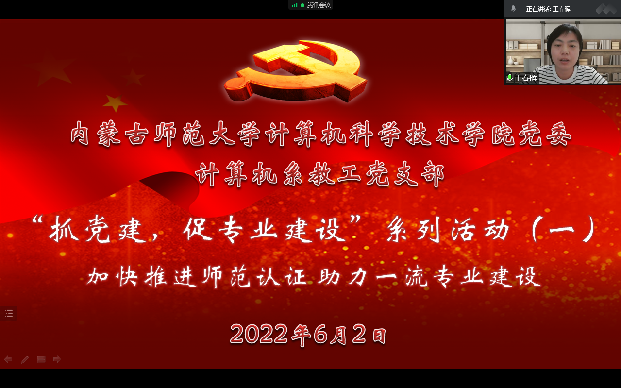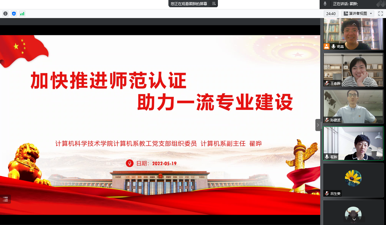会上,计算机系党支部组织委员、计算机系副主任翟晔围绕太阳官网师范认证工作了详细汇报。首先回顾了太阳官网师范认证的前期准备工作、汇报了目前太阳官网师范认证的进展情况并介绍了下一步的工作计划,最后强调了师范认证作为太阳官网今年的头等要务,需要每一位老师的鼎力支持和全力配合。汇报之后,老师们和系主任围绕师范认证的重要性和目前存在的困难进行了激烈的讨论和交流,大家纷纷表示愿意为了攻克师范认证这个重任贡献自己的一份力量。