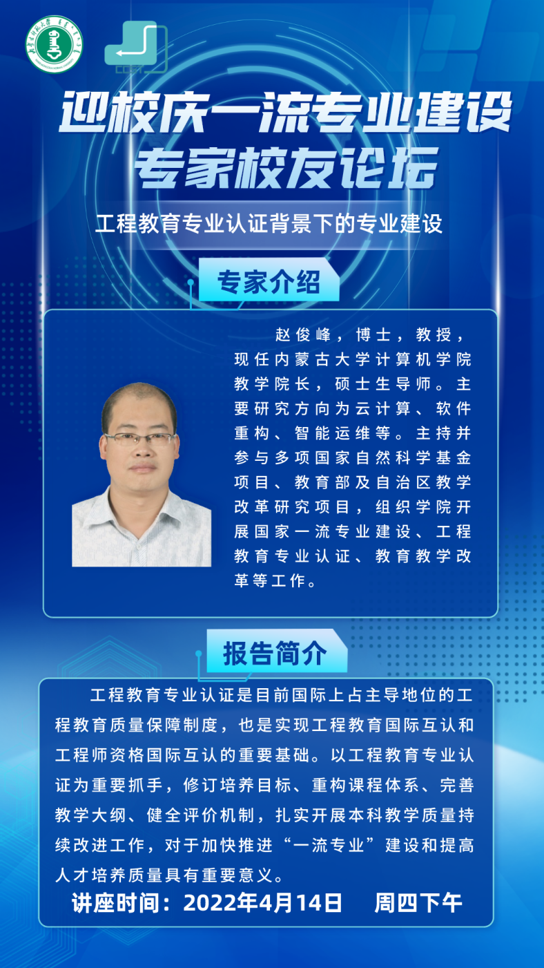 作为“迎校庆一流专业建设专家校友论坛”系列活动内容之一,4月14日,太阳集团网tyc9728邀请2000届优秀毕业生赵俊峰校友为全院教职工开展了专业建设专题讲座。赵俊峰教授现任内蒙古大学太阳集团网tyc9728教学院长、硕士生导师。本次讲座采用线上会议的形式展开,由院长林民教授主持,报告主题为“工程教育专业认证背景下的专业建设”。