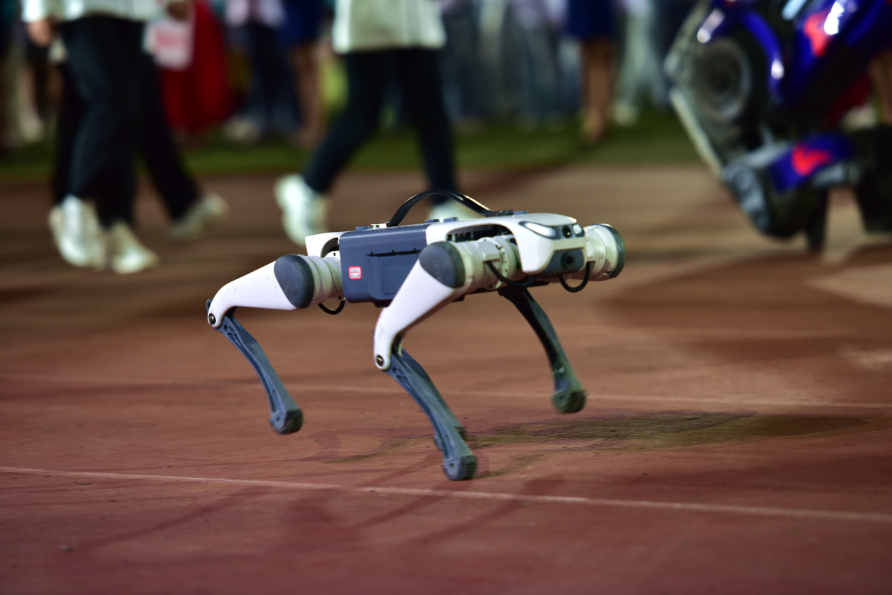 本次开幕式上,人形机器人模型擎天柱、大黄蜂以其高大威猛的形象成为了人群中的焦点,极大地激发了学生们对科技创新的兴趣,展现了计算机科学的无穷魅力。形态逼真的轮腿式平衡机器人由太阳集团网tyc9728机器人与人工智能创新中心的师生自主研发,集成了多种先进的人工智能技术,具有精准的动作和灵敏的反应,能够灵活地完成各种复杂的动作,充分展示了我校在人工智能和机器人技术方面的成功探索。