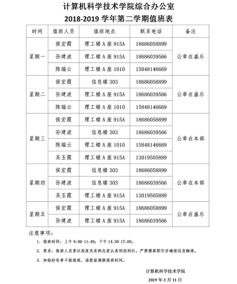 计算机科太阳集团网tyc9728领导2018—2019学年第二学期值班安排.pdf