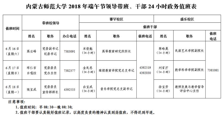 2.请各单位务必于6月15日前将本单位值班表分别报校长办公室(赛罕校区报送至田家炳教育书院楼709室,盛乐校区报送至创业楼209室)和保卫处。